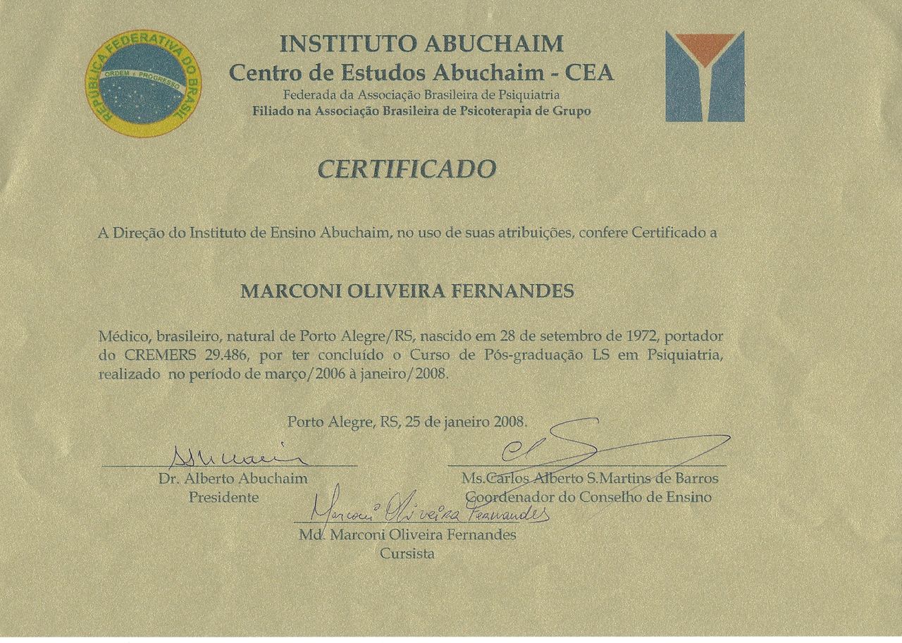 - Especialização em Psiquiatria, Instituto Abuchaim (2008)