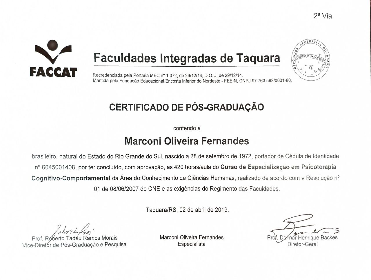 - Pós-Graduação Lato Sensu em Psicoterapia Cognitivo-Comportamental pelo IWP (2019) "NÃO ESPECIALISTA"